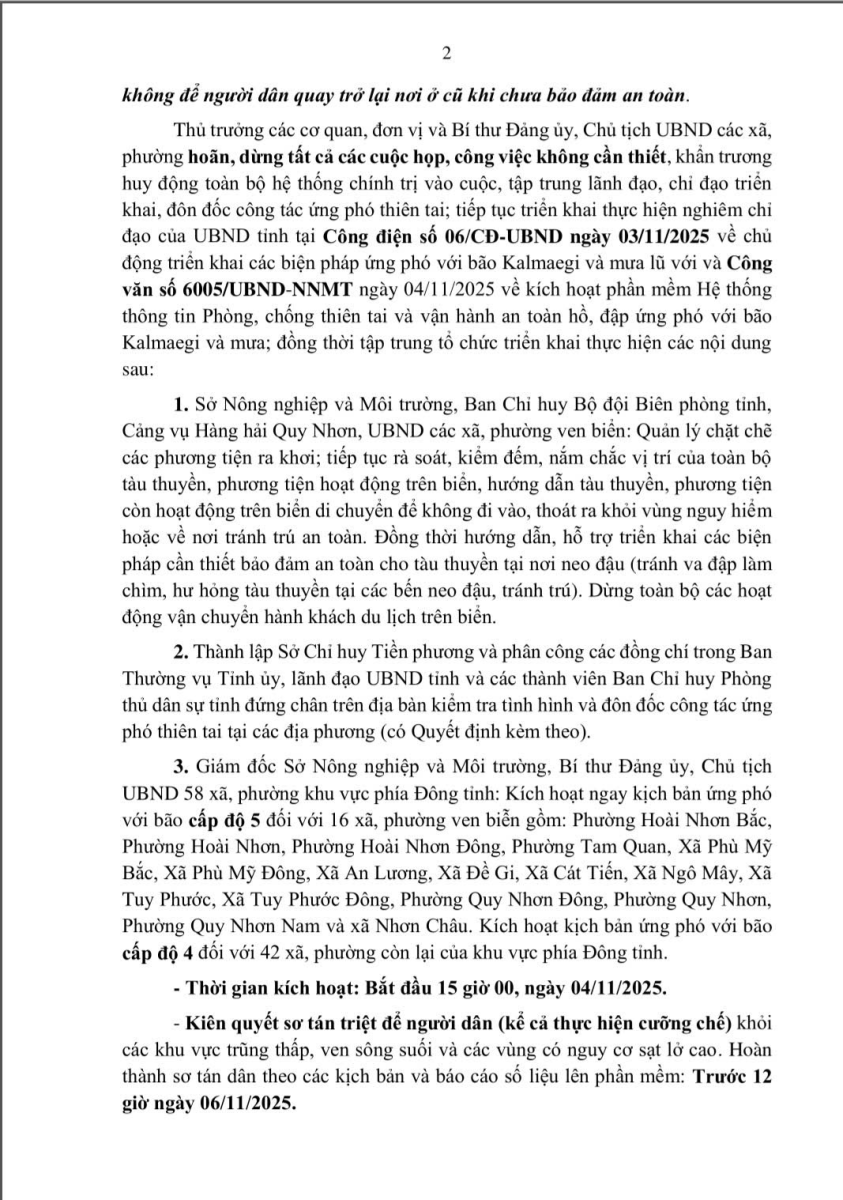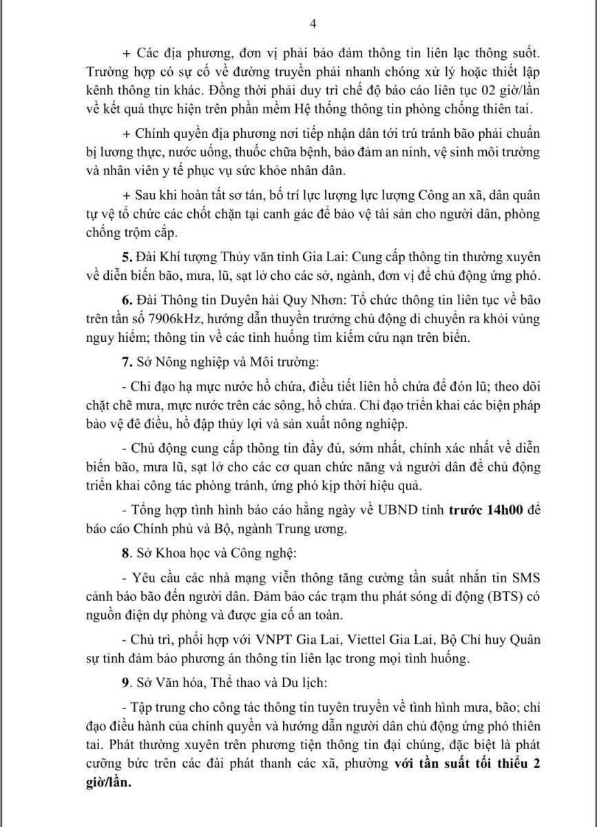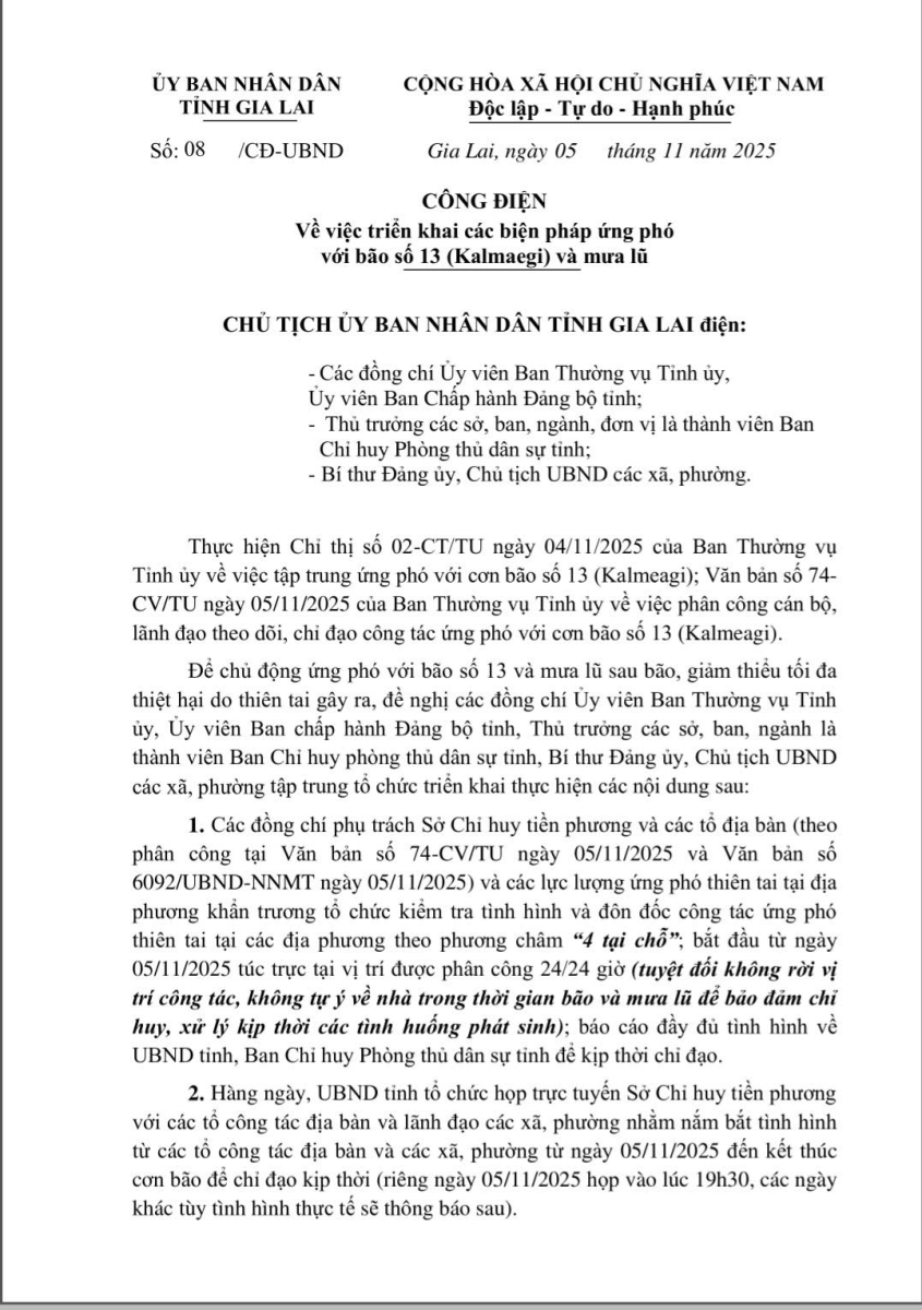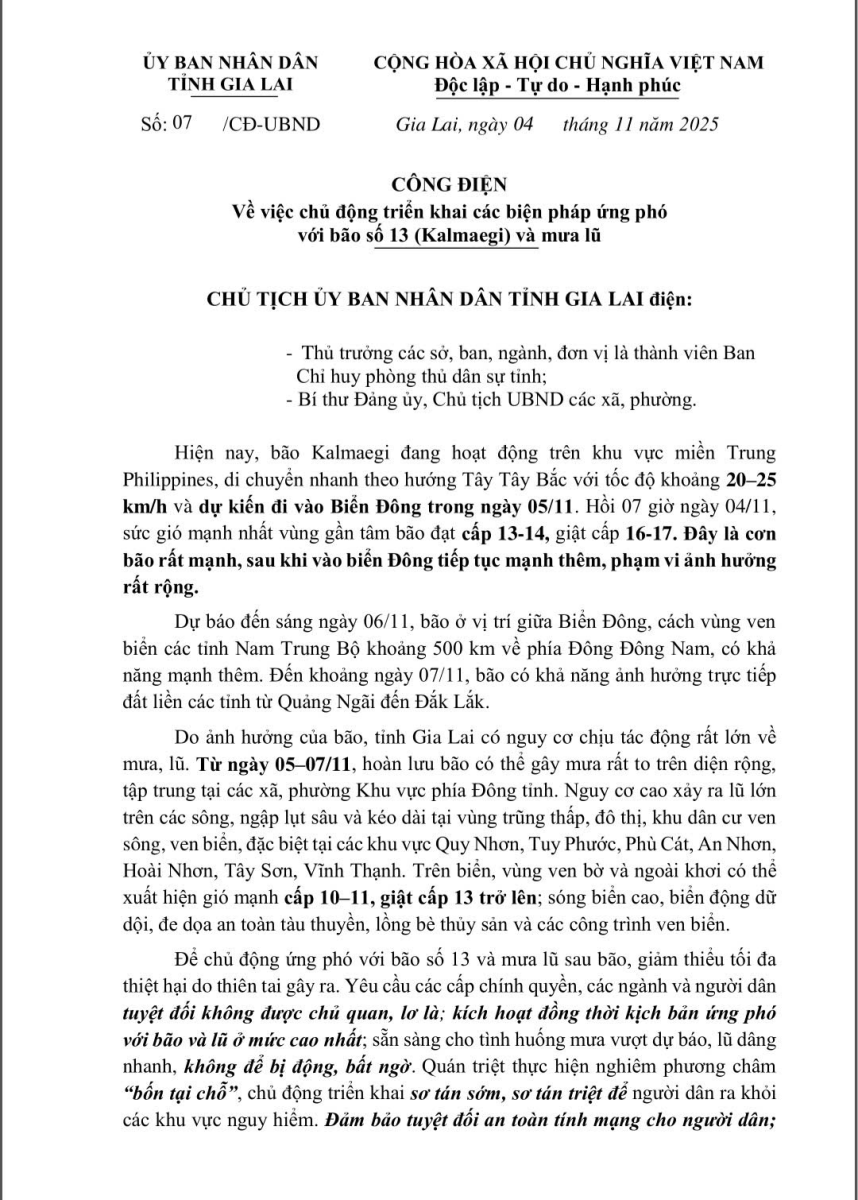 Công điện số 07/CĐ-UBND ngày 4/11/2025 và Công điện số 08/CĐ-UBND ngày 5/11/2025 của Chủ tịch UBND tỉnh Gia Lai, về việc chủ động triển khai các biện pháp ứng phó với bão số 13(Kalmaegi) và mưa lũ