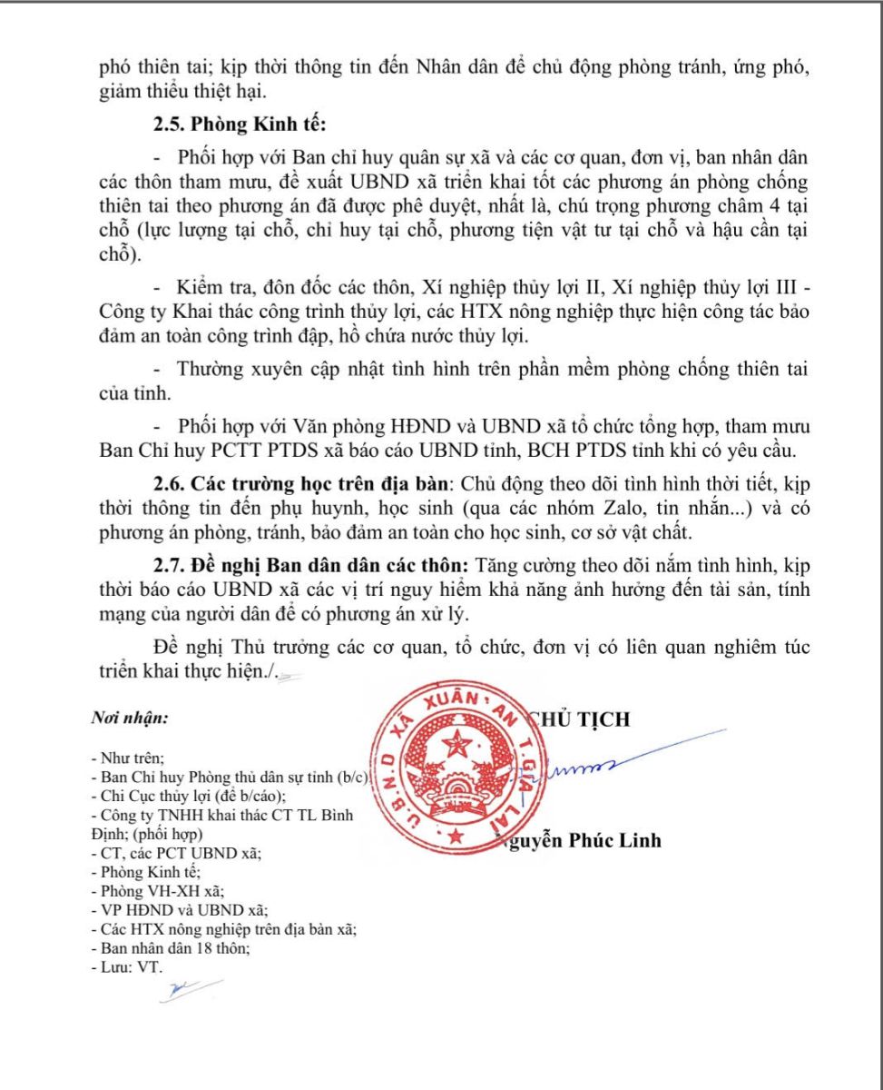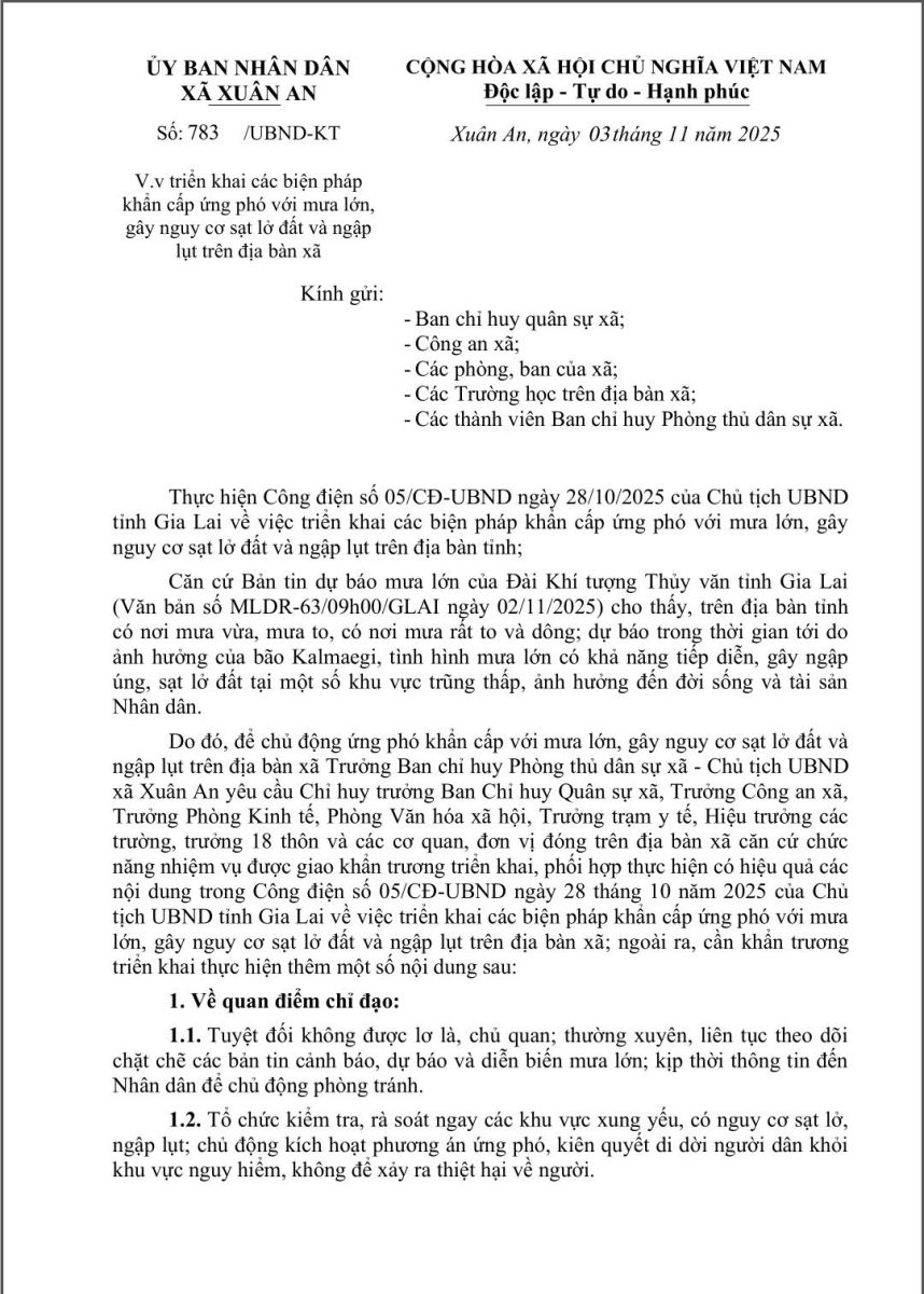 Nội dung Công văn số 783 /UBND - KT của UBND xã Xuân An, triển khai các biện pháp khẩn cấp ứng phó với mưa lớn, gây nguy cơ sạt lở đất và ngập lụt trên địa bàn xã