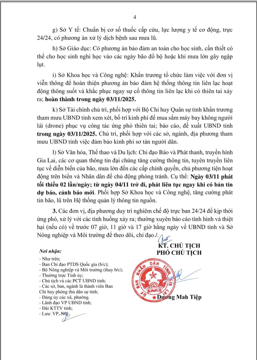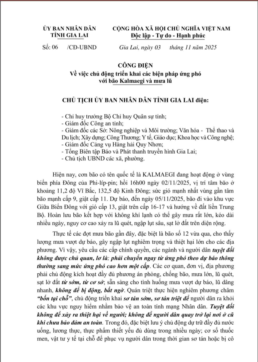 Công điện số 07/CĐ-UBND ngày 4/11/2025 và Công điện số 08/CĐ-UBND ngày 5/11/2025 của Chủ tịch UBND tỉnh Gia Lai, về việc chủ động triển khai các biện pháp ứng phó với bão số 13(Kalmaegi) và mưa lũ