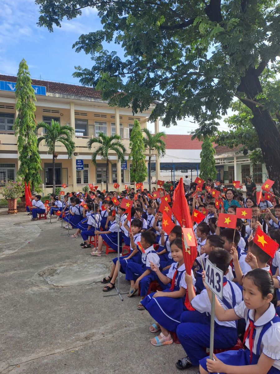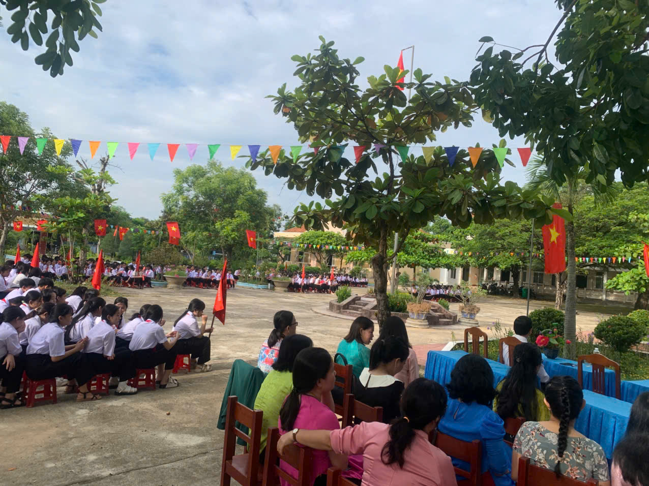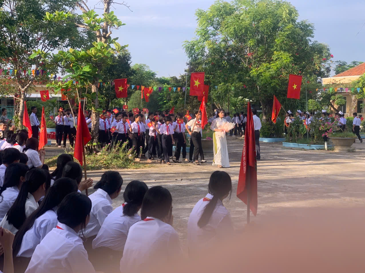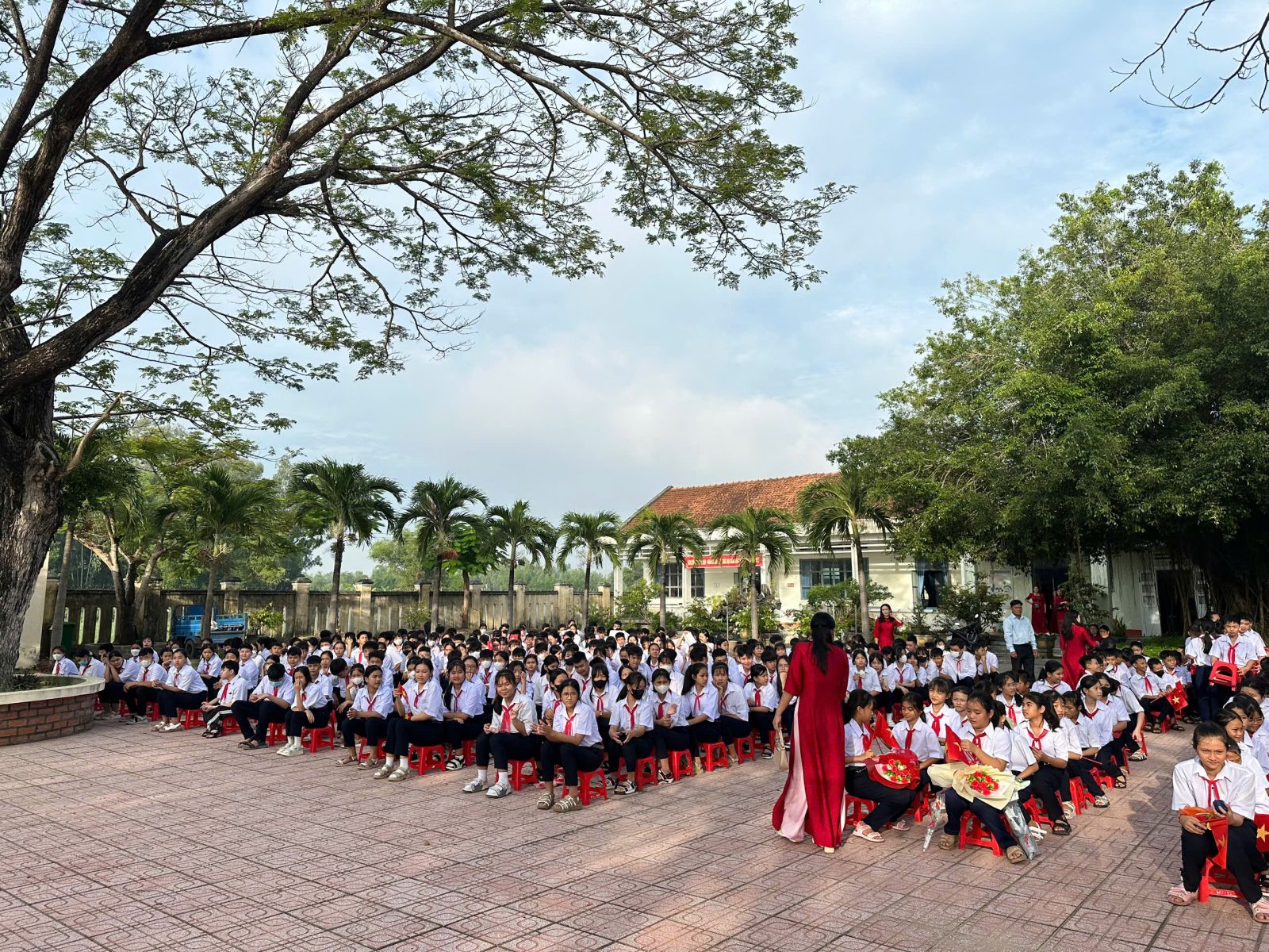 Các bạn học sinh lớp 6 của Trường THCS Cát Nhơn hân hoan vẫy cờ hoa, bước những bước chân đầu tiên vào ngôi trường mới khang trang, chào năm học mới 2025-2026.