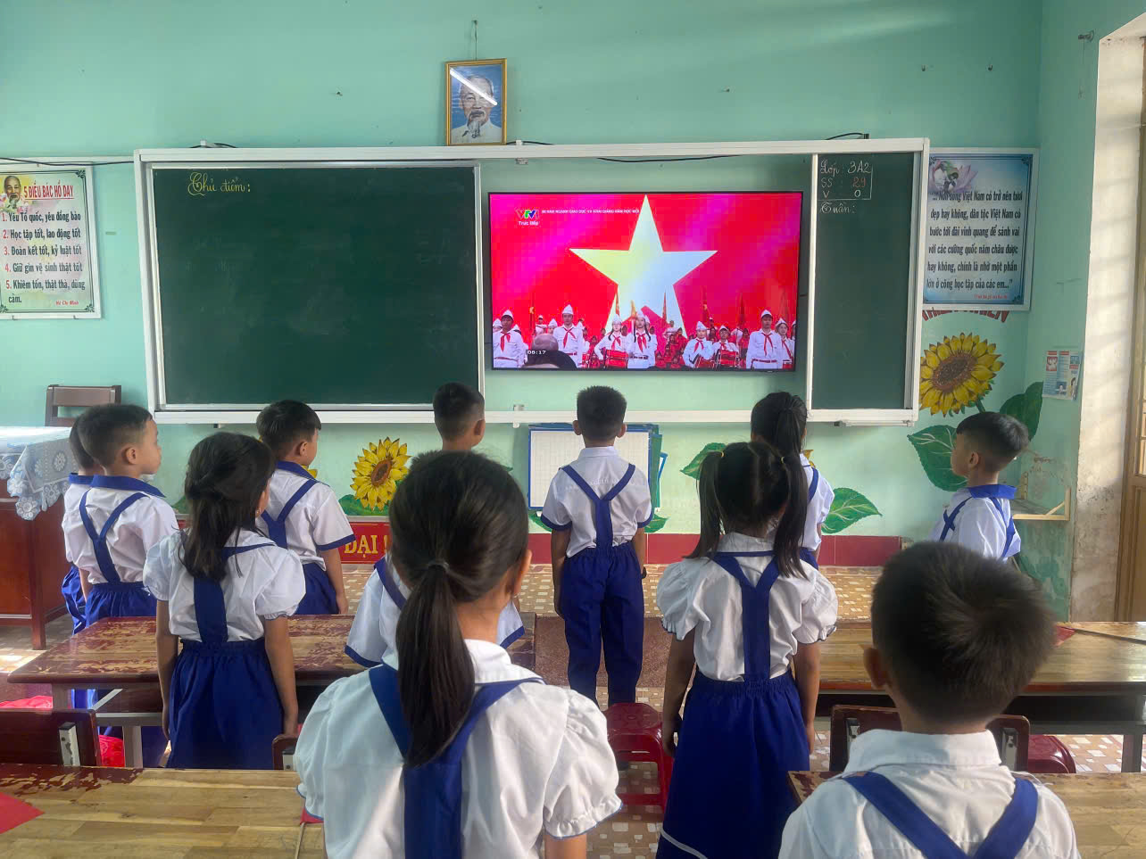 Các em học sinh lớp 1- Trường tiểu học số 2 Cát Tường - Dự Lễ Chào cờ trực tuyến cùng học sinh cả nước.